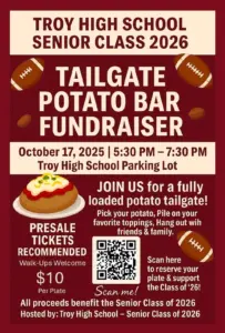 (TROY) FRIDAY Troy High School Senior Class- Tailgate Potato Bar Fundraiser- Pick your potato and pile on your toppings / Presale tickets recommended- Walk ups welcome $10 per plate / Troy High School Parking Lot 5:30-7:30pm Hosted by Troy High School with all proceeds benefit the Troy High School Class of 2026