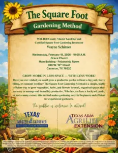 (CAMERON) Wednesday, February 18, 2026. The Little River Basin Master Gardeners are inviting the public to join them for a free presentation on the square foot gardening method. (LRBMGA) A presentation on an efficient and productive gardening method to grow vegetables, herbs, and flowers in small, organized spaces. The Square Foot Gardening Method program will be held Wednesday, February 18th, 10 am, at Grace Church (Main Building – Fellowship Room), 808 West 16th, Cameron. All are welcome to attend this free event.